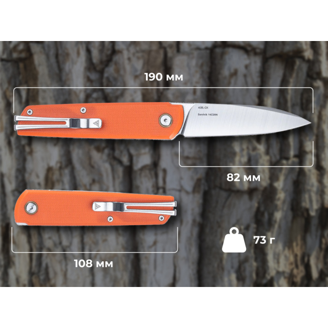Модель сягає 190 мм при відкритті, з них 82 мм — клинок завтовшки 3.1 мм. Вага складає лише 73 г, тому конструкція практично не відчувається під час носіння та не втомлює руку при тривалій експлуатації.