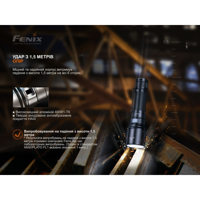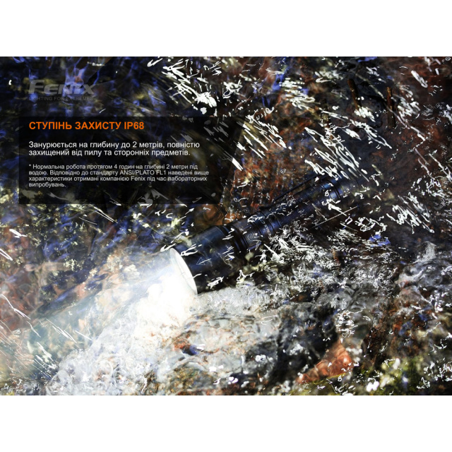 Ступінь захисту від води та пилу IP68 підтверджує повну герметичність оболонки та придатність до експлуатації у складних погодних умовах. Ударостійкість ліхтаря становить 1 м.