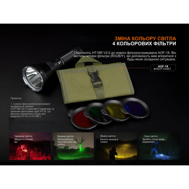 Ліхтар Fenix HT18R v2.0, акумулятор ARB-L21-6000, зарядний кабель USB-C, темляк, чохол, запасне ущільнювальне кільце, інструкція користувача, гарантійний талон.
