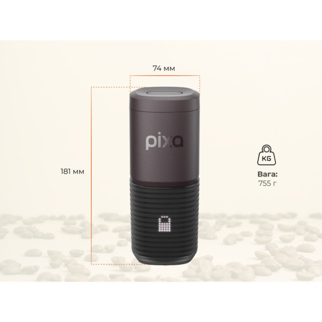 Корпус стійкий до водяних бризків, але його не можна повністю занурювати у воду або мити в посудомийній машині. З урахуванням компактності 74 х 74 х 181 мм та чохла в комплекті, Pixapresso поміщається у рюкзаку, сумці або бардачку автомобіля, щоб ви насолоджувалися улюбленими напоями у будь-якій точці світу.