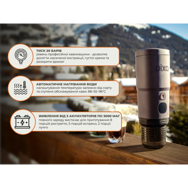 Wacaco Pixapresso — перша електрична еспресо-кавоварка від Wacaco. З її допомогою ви можете готувати улюблений гарячий напій, де б не знаходилися: вдома, на роботі, на пікніку або подорожі. Все, що вам потрібно, — улюблена кава, вода та не більше 5 хвилин часу!