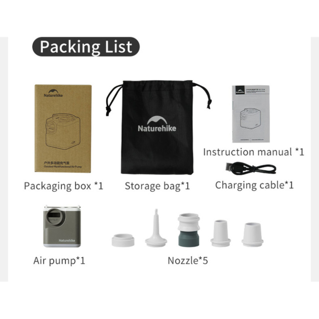 Насос-ліхтар Naturehike CNK2550ZM012, зарядний кабель, набір з 5 насадок, чохол для зберігання, інструкція користувача.