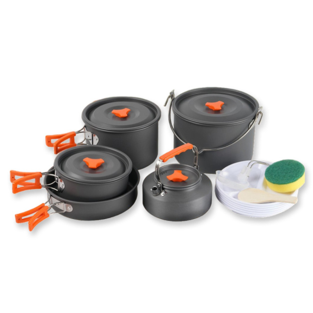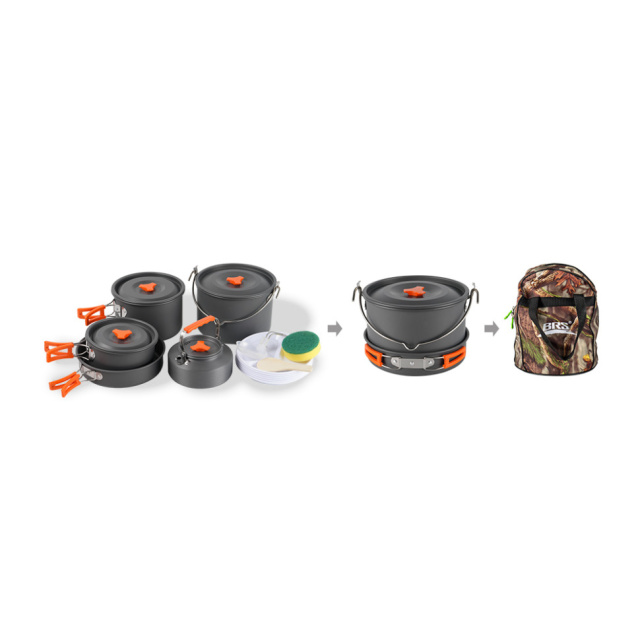 Набір посуду BRS-157 складається з розширеної кількості предметів для приготування та сервірування страв на велику групу людей. Комплект створений спеціально для походів, сімейних виїздів, кемпінгу та риболовлі, коли потрібно одночасно нагодувати користувачів першою та другою стравами, а також заварити гарячі напої.