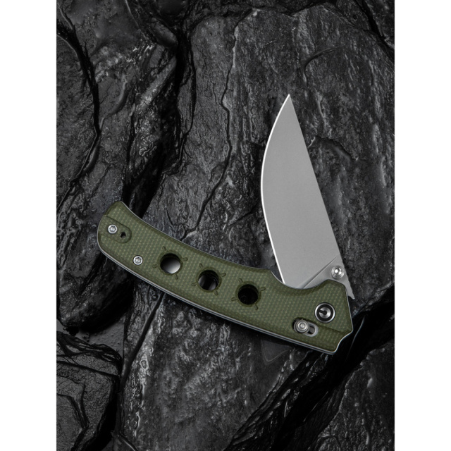 Руків'я моделі виконане з Canvas Micarta — матеріалу, який цінується за свою міцність та приємні тактильні відчуття. На відміну від пластику, мікарта здається «теплою» в руці, а при намоканні її зчеплення з долонею тільки посилюється, що гарантує повний контроль над інструментом. Лаконічна форма руків’я дозволяє зручно працювати ножем, не втомлюючи кисть.