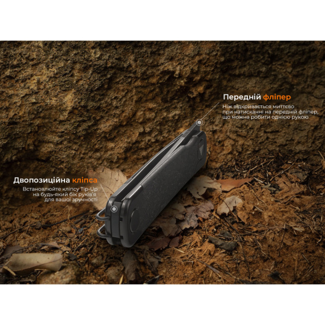 Клинок Clip Point з піднятим гострим кінчиком підходить для проколювання та контрольованого різання. Водночас ніж розрахований не лише на делікатну, а й на силову роботу — для цього на обуху передбачено упор для великого пальця, що дозволяє краще контролювати лезо.