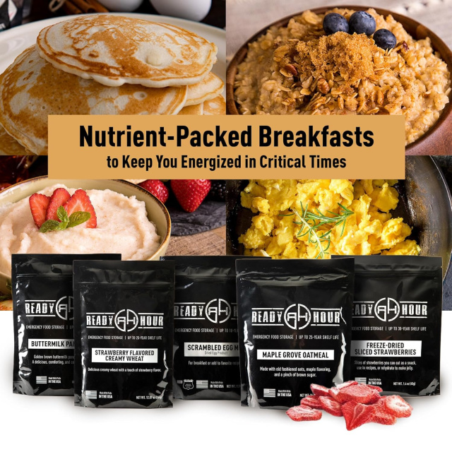 Набір сублімованих сніданків Ultimate breakfast kit від компанії Ready Hour містить 5 видів сніданків і 2 види напоїв загальною кількістю 128 порцій (американського стандарту), загальною калорійністю 16080 калорій.