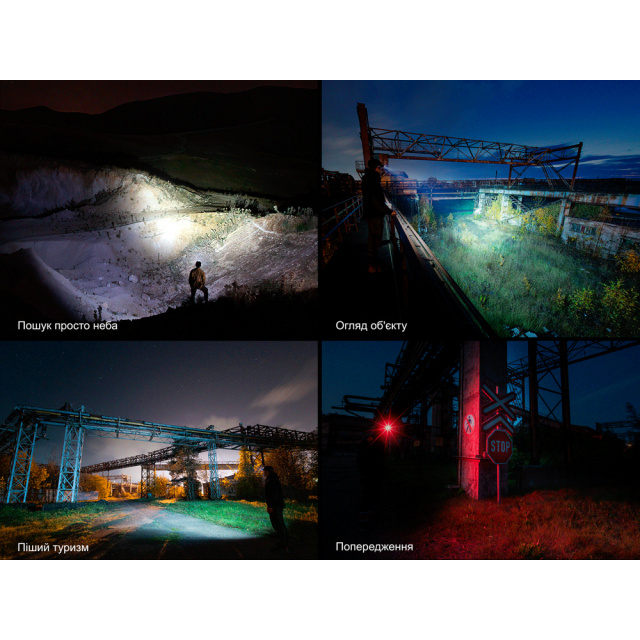 Основний світлодіод Luminus SST40-GEN2 видає холодне біле світло (6500K) і розрахований на дистанції до 195 м. Для роботи з документами або поблизу додано діод OSRAM 1414 CRI90, який дає нейтральне розсіяне світло без спотворення кольорів. Окремий червоний діод OSRAM 1414 яскравістю до 70 люмен дозволяє зберегти нічний зір або працювати в режимі сигнального маяка.
