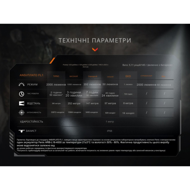 Ліхтар має захист за стандартом IP68, витримує занурення на глибину до 2 м та падіння з висоти 1.5 м.