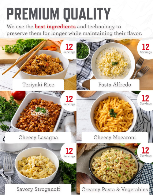 Набір з 11 основних страв ReadyWise entree bucket розрахований для повноцінного харчування однієї людини на термін 13 днів зі щоденною нормою 1873 калорій. У цьому наборі міститься 11 основних страв, з яких 3 супи та 8 других страв. Він містить 120 порцій (американського стандарту) та розрахований на дуже довгий термін зберігання – до 25 років без холодильника.
