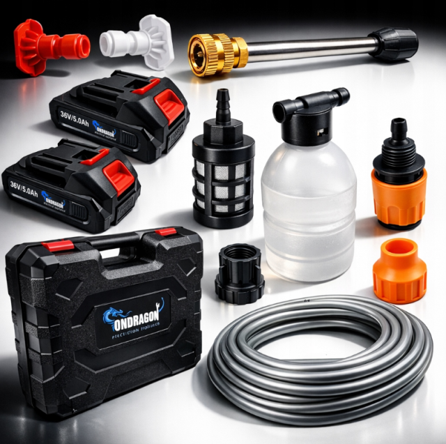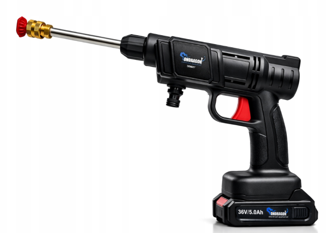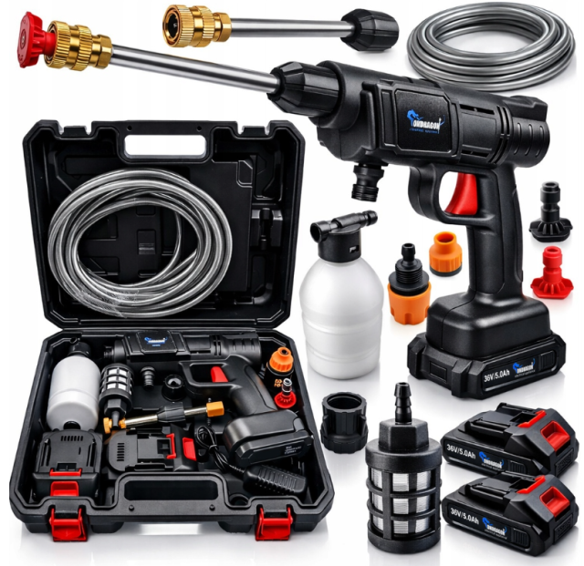 - Портативна акумуляторна мийка високого тиску з безщітковим двигуном, що забезпечує максимальний тиск води 30 барів.