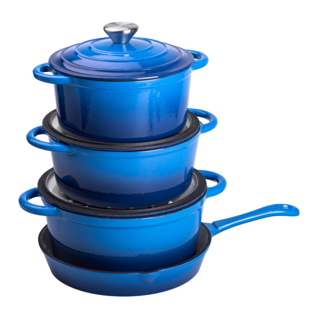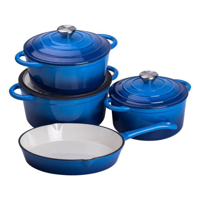 Набор чугунной посуды создан для тех, кто ценит качество и удобство в приготовлении пищи. В него входят три кастрюли объемом 2, 3 и 5 литров, а также компактная сковорода на 1 литр. Такой набор позволяет с легкостью готовить супы, рагу, мясные и овощные блюда, обеспечивая идеальное распределение тепла. Чугун отличается высокой теплоемкостью, что способствует равномерному прогреву продуктов и сохранению их естественного вкуса. Толстые стенки и дно предотвращают перегрев и обеспечивают стабильную температуру во время готовки. Литые ручки удобны в использовании и устойчивы к высоким температурам. Основные характеристики набора чугунной посуды с эмалированным покрытием Кастрюля на 2 литра Диаметр дна: 16.5 см; Высота кастрюли без крышки: 9.5 см; Высота кастрюли с крышкой: 16 см. Кастрюля на 3 литра Диаметр дна: 19 см; Высота кастрюли без крышки: 9 см; Высота кастрюли с крышкой: 16 см. Кастрюля на 5 литра Диаметр дна 21 см; Высота кастрюли без крышки: 11 см; Высота кастрюли с крышкой: 16 см. Сковорода на 1 литр Диаметр дна: 22 см; Высота сковороды с крышкой: 4 см. Посуда подходит для газовых и электрических плит, а также для приготовления на открытом огне, что делает ее отличным выбором как для кухни, так и для кулинарных экспериментов на природе. При правильном уходе чугун служит десятилетиями, не теряя своих свойств. Этот набор станет незаменимым помощником для любителей вкусных и насыщенных блюд, обеспечивая удобство и долговечность на долгие годы.