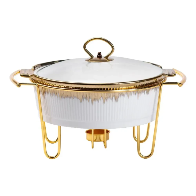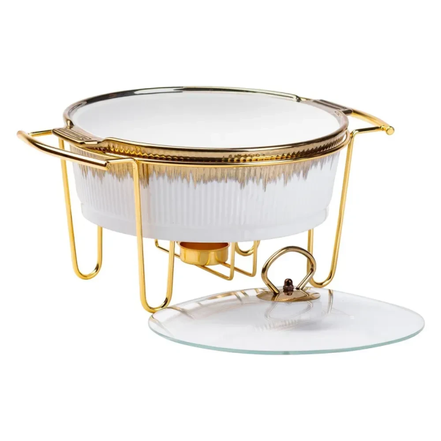Настольная мармитница круглая на металлической подставке станет идеальным выбором для любого банкета или праздничного мероприятия. Металлическая подставка обеспечивает надежную поддержку мармита и удобство при подаче блюд. Мармит используется для поддержания температуры блюд, сохраняя их аромат. Основные характеристики круглого мармита: Объем: 1.5 литра; Размер: 30х23х18 см; Материал: фарфор; Материал: крышки стекло; Материал: подставки металл. фарфоровый мармит является не только практичным, но и эстетически привлекательным выбором для любого стола, обеспечивая удобство и стиль во время сервировки блюд. Купить мармит фарфоровый можно с доставкой по всей Украине.