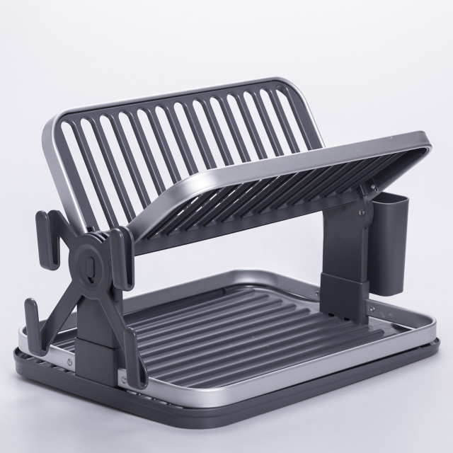 Эта компактная складная сушилка для посуды сочетает прочный алюминиевый каркас и долговечный пластик. Верхний ярус складывается «книжкой», что позволяет экономить место и адаптировать сушилку под разное количество посуды. Отличный выбор для маленькой кухни, аренды или дачи — практично, аккуратно и удобно. Материалы сушилки для кухни: Алюминий: каркас и решётка прочные, лёгкие и устойчивые к коррозии; Пластик: поддон и держатели долговечные, влагостойкие и удобные в уходе. Конструкция и вместимость сушилки: Двухъярусная модель с откидным верхним уровнем для экономии пространства; Подходит для тарелок, чашек, ножей и кухонных аксессуаров; Оснащена держателями и отделениями для столовых приборов. Поддон и удобство эксплуатации: Съёмный пластиковый поддон собирает воду; Легко вынимается и моется; Поддерживает чистоту и защищает поверхность стола. Преимущества складной сушилки для посуды: Компактность при хранении; Простота ухода и чистки; Хорошая вентиляция и быстрое высыхание посуды; Универсальность использования на кухне, в квартире или на даче. Характеристики сушилки: Материал: алюминий, пластик; Размер нижнего яруса: 41*33 см; Размер верхнего яруса: 40*30 см; Общие размеры: 48*33*27 см; Вес: 1,7 кг.