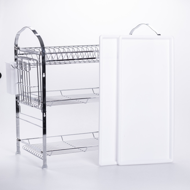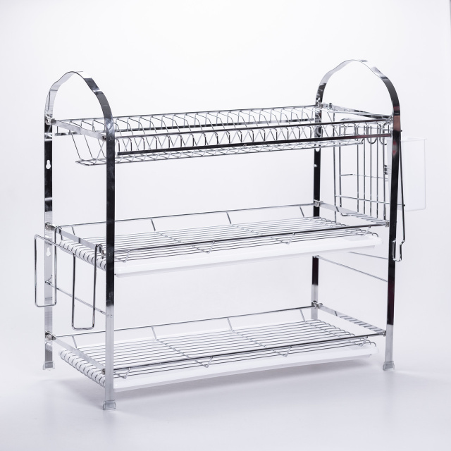 Эта практичная и вместительная сушилка для посуды выполнена из хромированной стали, что гарантирует долговечность, устойчивость к коррозии и удобство ухода. Конструкция с тремя уровнями позволяет рационально разместить различный кухонный инвентарь: верхний ярус подходит для тарелок и крышек, средний и нижний – для чашек, мисок и сковород. Особенности сушилки для кухни: Материал: хромированная сталь с блестящей поверхностью, устойчива к ржавчине и легко очищается; Ярусы: верхний, средний и нижний – распределяют посуду по типу и размеру, увеличивая вместимость; Поддоны: съёмные пластиковые поддоны на верхнем и среднем ярусах собирают воду и предотвращают подтекания; Дополнительные элементы: боковые держатели и контейнер для столовых приборов, закрепляемый сбоку; Конструкция: прочная рама, открытые полки обеспечивают циркуляцию воздуха и быстрое высыхание посуды. Преимущества трёхъярусной сушилки для посуды: Экономия пространства и порядок на кухне; Удобное распределение посуды по уровням; Простота очистки благодаря съёмным поддонам; Долговечность и устойчивость к влаге; Стильный внешний вид для современной кухни. Характеристики сушилки: Материал: хромированная сталь, пластик; Размеры: 552714 см; Вес: 3,2 кг.