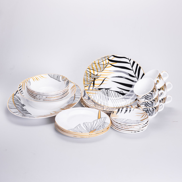 Набор столовой посуды на 6 персон — это не просто элементы сервировки, а способ превратить каждую трапезу в эстетическое удовольствие. Выполненный из прочного фарфора, он сочетает в себе изящество классической посуды и современный декоративный стиль. Сервиз одинаково гармонично смотрится как в повседневной кухонной атмосфере, так и на праздничном столе. Он подчеркивает важность момента и завершает композицию интерьера. Особое внимание уделено не только внешнему оформлению, но и практичности: фарфор отличается высокой прочностью, гладкой блестящей глазурью, а декоративные элементы выдерживают регулярное использование при правильном уходе. Такой комплект станет удачным выбором для дома и прекрасным подарком, оставляющим приятное впечатление. Состав столового сервиза: • глубокая тарелка: 6 шт.; • десертная тарелка: 6 шт.; • подставная тарелка: 6 шт.; • блюдце: 6 шт.; • чашка: 6 шт.; • салатница: 1 шт.; • блюдо: 1 шт. Характеристики набора: • материал: фарфор; • количество предметов: 32 шт.; • объем чашки: 200 мл; • объем суповой тарелки: 400 мл; • объем салатницы: 1,4 л; • размеры: 35×26; 25; 23; 20; 17; 14; 8,5 см; • высота: 7; 6,5; 5; 3; 1,5 см; • вес набора: 10,4 кг.