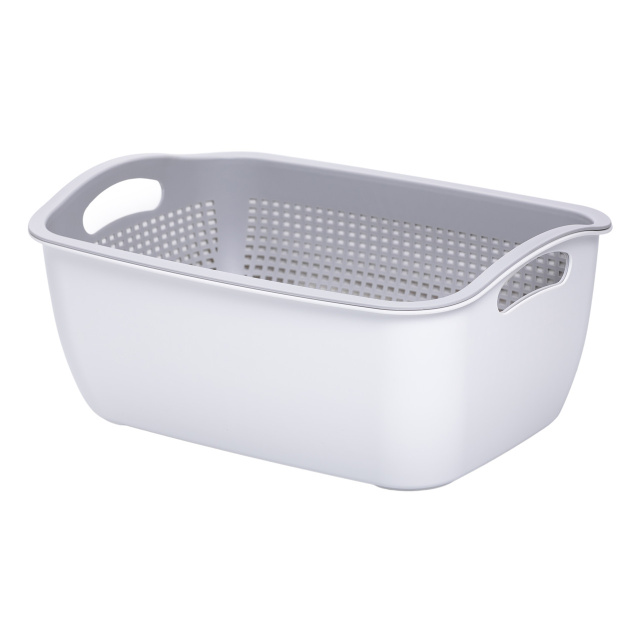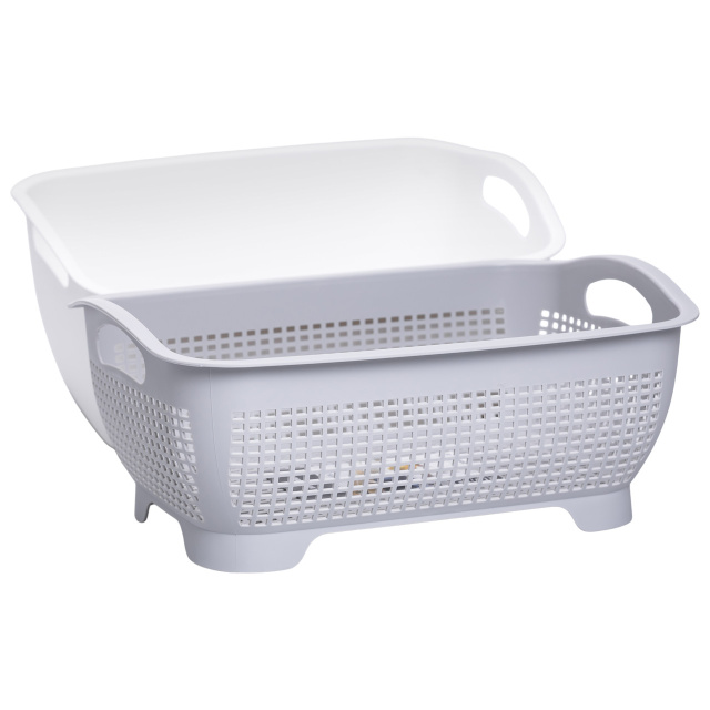 Практичный набор для мытья овощей и фруктов станет незаменимым помощником на кухне. Две функциональные части — корзина и дуршлаг — позволяют удобно промывать продукты, быстро сливать воду и использовать аксессуар в разных целях: от подготовки и хранения до сервировки. Основные характеристики корзины-дуршлага для мытья овощей, фруктов и зелени: Размер: 29.5×21×11 см; Объем: 4 л ; Материал: пластик. Особенности дуршлага для мытья овощей, фруктов: Удобная форма: прямоугольная конструкция с широкими краями и ручками по бокам позволяет легко переносить корзину. Перфорированные стенки: обеспечивают быстрый слив воды и предотвращают её застой. Вместимость: подходит для мытья фруктов, овощей, зелени или ягод. Прочный материал: выполнена из качественного пластика, устойчивого к влаге и простого в уходе. Универсальность: можно использовать как дуршлаг, контейнер для хранения или даже сервировочную корзину. Эта корзина для мытья овощей, фруктов и зелени станет незаменимым помощником на кухне — она проста в использовании, экономит время и помогает поддерживать продукты свежими и чистыми.