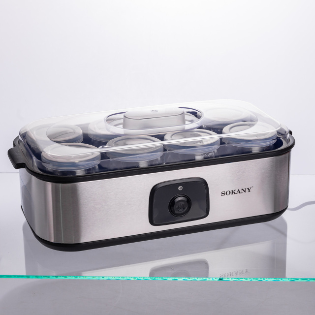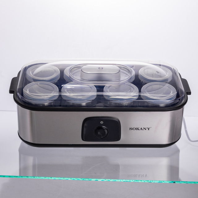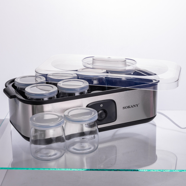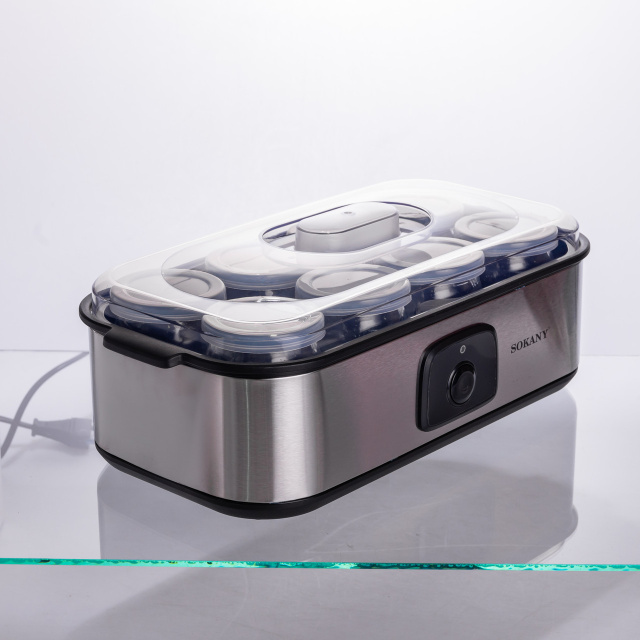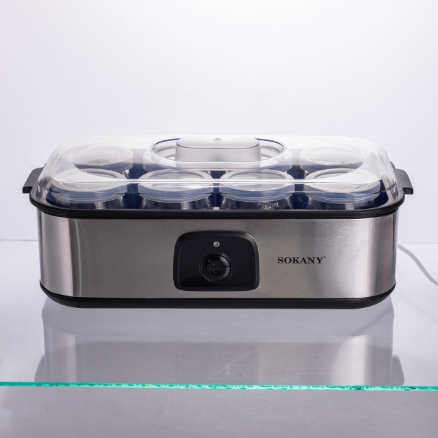 Йогуртница Sokany SK-08109 — это современное устройство, которое поможет легко приготовить домашний йогурт без добавок и консервантов. Просто залейте ингредиенты, установите время, и техника сама создаст идеальные условия для ферментации. Благодаря этой модели вы сможете ежедневно наслаждаться вкусным и полезным йогуртом, приготовленным своими руками. Основные характеристики электрической йогуртницы: Мощность: 20 Вт; Размер: 33×19×12 см; Количество баночек: 8; Объем баночек: 180 мл; Время приготовления: 8-12 часов; Длина сетевого шнура: 75 см; Материал корпуса: металл, пластик; Материал баночек: стекло + силикон. Особенности аппарат для приготовления йогурта: Оптимальный нагрев: обеспечивает стабильную температуру для равномерного созревания йогурта. Удобные баночки (по 180 мл): удобно порционировать и хранить готовый продукт. Простота ухода: все съёмные детали легко очищаются вручную, корпус достаточно протирать влажной салфеткой. Йогуртница Sokany SK-08109 — это надёжный и практичный помощник для тех, кто заботится о здоровом питании. Она делает процесс приготовления простым, а результат — вкусным и натуральным. С её помощью вы сможете радовать себя и своих близких свежим йогуртом каждый день!