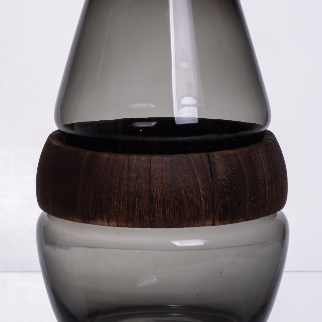 Декоративная стеклянная ваза с деревянными элементами Эта изысканная ваза объединяет прозрачное стекло и натуральное дерево, создавая гармоничное сочетание природной теплоты и современного минимализма. Прочная стеклянная часть подчёркивает чистоту линий и визуальную лёгкость, а деревянная основа добавляет уютный акцент и делает изделие выразительным элементом интерьера. Такая ваза станет стильным украшением в доме, офисе или кафе, подчёркивая утончённость и вкус владельца. Преимущества стеклянной вазы с деревом: Материалы и качество: выполнена из прочного прозрачного стекла и натурального дерева с выразительной фактурой; Дизайн и стиль: сочетание дерева и стекла создаёт современный контраст, подходящий для интерьеров в стиле скандинавский, эко-шик, минимализм или рустик; Использование: подходит для свежих и сухих цветов, декоративных веток или как самостоятельный акцентный элемент декора; Эстетика и практичность: устойчивая деревянная база обеспечивает надёжность, а стеклянная часть придаёт изделию лёгкость и утончённость; Уход: мыть стеклянную часть мягкой губкой с тёплой водой, деревянные элементы протирать сухой тканью, избегая длительного контакта с влагой. Рекомендации по стилю: Скандинавский интерьер: сочетать с нейтральными тонами, светлыми оттенками дерева и мягким текстилем; Эко-дизайн: дополнить растительными композициями и натуральными материалами; Рустикальный стиль: разместить на полке, комоде или столе рядом с природными аксессуарами. Характеристики вазы: Материал: стекло, дерево; Форма: круглая, конусная; Размер: диаметр 10 см, высота 24 см; Объём: 2 л; Вес: 1,1 кг.