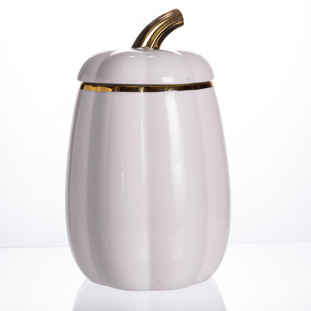 Фарфоровая банка для хранения продуктов в виде тыквы представляет собой практичное решение для кухонного пространства, объединяющее функциональность с декоративным осенним оформлением. Благодаря своей форме и цветовому решению легко вписывается в сезонный интерьер или становится частью тематического декора стола. Вместительность 3,8 литра предоставляет достаточный объем для размещения круп, сахара, печенья или других кухонных мелочей. Выполненная из качественного фарфора, емкость обладает ровной глянцевой поверхностью белого оттенка. Фарфоровая крышка дополнена резиновой прокладкой для герметичного закрывания. Золотые элементы в виде ручки и окантовки создают изысканный декоративный штрих, сохраняя при этом универсальность дизайна. Сочетание вместимости, качественного материала и плотного прилегания крышки делает банку идеальной для повседневного применения на кухне или в сервировочных целях. Компактные размеры - высота 29 см с крышкой, диаметр 14 см - позволяют удобно размещать на полках или в шкафах без потери полезного пространства. Изделие легко моется, не поглощает ароматы и долго сохраняет первоначальный внешний вид. Технические характеристики банки для хранения: • Наименование товара: Банка для хранения «Тыква»;&br />• Основной материал: Фарфор премиум качества;&br />• Материал крышки: Фарфор с резиновым герметизирующим элементом;&br />• Полезный объем: 3,8 литра;&br />• Цветовое исполнение: Белый с глянцевой отделкой;&br />• Ручка: Золотистого цвета;&br />• Декоративная отделка: Золотистая окантовка по периметру;&br />• Диаметр основания: 14 сантиметров;&br />• Общая высота: 29 сантиметров включая крышку;&br />• Функциональное применение: Хранение пищевых продуктов, декоративное оформление.