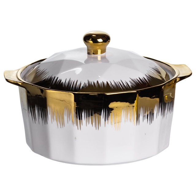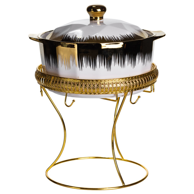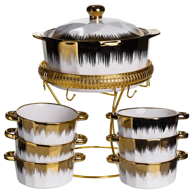 Суповой сервиз из высококачественного фарфора станет украшением любого стола и придаст сервировке нотку изысканности. Элегантное сочетание белого цвета с золотыми и черными акцентами делает набор особенно нарядным и современным. В комплект входит супница с крышкой и шесть суповых тарелок, на прочной металлической подставке с золотым покрытием. Благодаря удобной форме и продуманному дизайну сервиз не только красив, но и практичен в использовании. Основные характеристики супового сервиза: Материал: фарфор + металл; Размер: 25×25×32 см; Объем супницы: 2 литра; Объем тарелок: 300 мл; Диаметр супницы: 20.5 см. Такой набор прекрасно подойдет для семейных обедов, праздничных ужинов или торжественных мероприятий. Он станет отличным подарком на свадьбу, новоселье или юбилей, подчеркивая вкус и внимание к деталям хозяев дома.