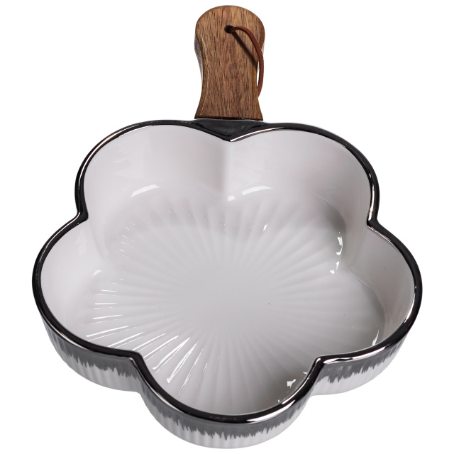 Тарелка с ручкой для подачи и сервировки выполнена из высококачественного фарфора и сочетает в себе изысканный дизайн и практичность. Оригинальная форма делает её не только функциональным элементом посуды, но и стильным украшением стола. Изделие удобно использовать для подачи горячих и холодных блюд, закусок, салатов, фруктов или десертов. Прочная фарфоровая поверхность устойчива к высоким температурам, не впитывает запахи и легко очищается. Эргономичная деревянная ручка обеспечивает комфорт при переноске и подаче блюд. Основные характеристики сервировочной фарфоровой тарелки с деревянной ручкой: Материал: фарфор, дерево; Размер: 27×20×5 см; Объем: 800 мл; Особенности блюда для подачи: Размер оптимален для подачи фруктов, закусок, десертов, салотов или выпечки. Материал блюда — фарфор, который надолго сохраняет привлекательный внешний вид. Удобная деревянная ручка обеспечивает комфортное и безопасное использование. Оригинальная форма придаёт изделию изысканность. Подходит как для повседневного использования, так и для праздничной сервировки. Благодаря гармоничному сочетанию белого фарфора с изящной декоративной отделкой и натурального дерева, блюдо станет отличным дополнением к любой сервировке. Идеально подходит для домашнего использования, праздничных застолий, а также для ресторанов и кафе.