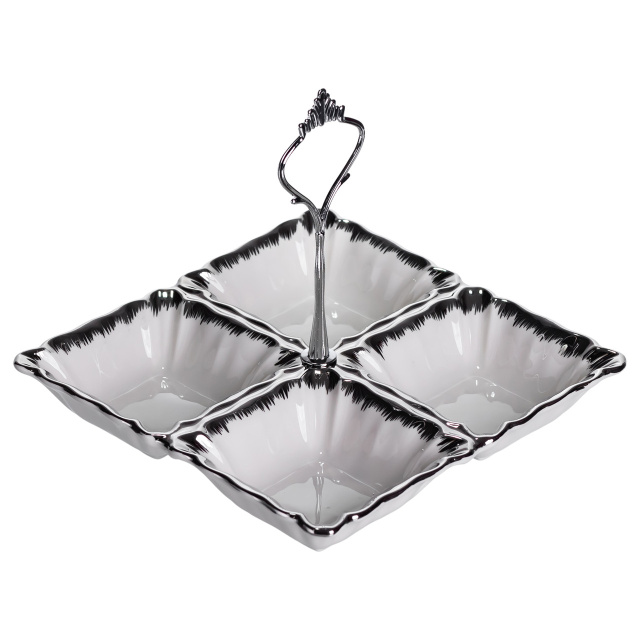 Менажница фарфоровая на 4 секции для закусок 18×18×3 (см) с ручкой Белый с серебром LC-BYL-100-S