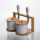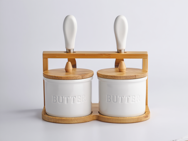 Набор из двух фарфоровых масленок на бамбуковой подставке — это удобное и элегантное решение для хранения сливочного масла, соусов или намазок. Крышки из натурального бамбука оснащены круглыми ручками, что делает их лёгкими в открывании и удобными в использовании. Над контейнерами расположена изящная рамка, в которой закреплены два ножа с белыми ручками и металлическими лезвиями — всё необходимое всегда находится на своём месте. Основные характеристики набора масленок Размер: 21×14×12 см; Диаметр масленок: 9 см; Высота масленок: 7.5см; Объем масленок: 300 мл; Материал: фарфор, бамбук. Такой набор объединяет функциональность и эстетику, превращая подачу масла или соусов в настоящий элемент декора. Он подчеркнёт вкус хозяйки, создаст атмосферу уюта за столом и станет отличным подарком для ценителей стильной сервировки.
