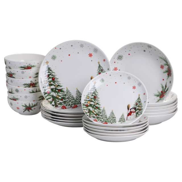 Фарфоровый столовый сервиз Christmas Tree из 24 предметов на 6 персон — удобное и стильное решение как для повседневных обедов, так и для праздничной сервировки. Изготовленный из высококачественного фарфора, он обладает гладкой поверхностью, устойчивой к царапинам и перепадам температур, а новогодний узор придаёт современный и элегантный вид. В комплект входят обеденные, десертные и глубокие тарелки, — всё необходимое для комфортного обеда или ужина на шестерых. Фарфор удерживает тепло, не впитывает запахи и легко моется, что делает использование сервиза удобным и практичным. Основные характеристики столового сервиза из фарфора: Количество предметов: 24; Количество персон: 6; Материал: фарфор; Диаметр тарелок: 26 см, 23 см, 20 см, 16 см; Миски: 700 мл. Основные преимущества сервиза Универсальность: подходит как для повседневного использования, так и для праздничных застолий. Долговечность: фарфор – это прочный и износостойкий материал, который прослужит вам долгие годы. Эстетичность: набор станет украшением вашего стола. Безопасность: фарфор не содержит вредных веществ и безопасна для здоровья. Легкость в уходе: набор можно мыть в посудомоечной машине. Этот фарфоровый сервиз станет практичным и элегантным дополнением любого стола, подходящим как для повседневных обедов, так и для праздничных ужинов. Он также отлично подходит в качестве стильного и полезного подарка.