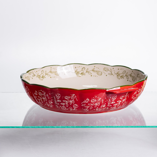 Фарфоровая форма для запекания создана для тех, кто ценит удобство и красоту на кухне. Ее стильное оформление с насыщенным красным цветом и нежным растительным орнаментом делает подачу блюд особенно эффектной. Основные характеристики формы для запекания: Материал: фарфор; Размер: 35×30×6 см; Диаметр: 30 см; Объем: 2.5 л. Особенности формы для выпечки: равномерно распределяет тепло и сохраняет его длительное время; подходит для запекания мяса, рыбы, овощей и десертов; оснащена удобными ручками для безопасного переноса; можно использовать в духовке и микроволновке. Такая форма станет незаменимой помощницей на вашей кухне — в ней удобно готовить как повседневные, так и праздничные блюда. Благодаря стильному дизайну, она идеально подходит для сервировки: готовое блюдо можно подавать прямо на стол, не перекладывая в другую посуду.