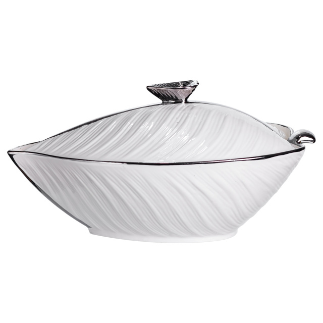 Современная фарфоровая супница с крышкой — это стильное решение для тех, кто ценит утончённый дизайн и практичность. Её оригинальная форма с мягкими линиями и серебристым кантом придаёт сервировке особый шарм, делая подачу блюд не просто удобной, а эстетически совершенной. Такая супница станет элегантным акцентом как на повседневном, так и на праздничном столе. Основные характеристики кастрюли бульонницы Объем: 1.5 л; Размер: 32×21×16 см; Материал: фарфор. Особенности фарфоровой супницы: Изготовлена из прочного высококачественного фарфора; Оригинальная форма с плавными изгибами и рельефной поверхностью; Серебристая окантовка подчёркивает современный стиль; Крышка с декоративной ручкой сохраняет тепло и аромат блюд; Гладкая глазурованная поверхность легко очищается и устойчива к пятнам. Эта фарфоровая супница сочетает в себе элегантность, функциональность и современный дизайн. Она идеально подойдёт для подачи супов, рагу и бульонов, а также станет красивым элементом сервировки. Универсальный стиль и изысканные детали делают её отличным выбором для дома или в качестве подарка ценителям красивой посуды.