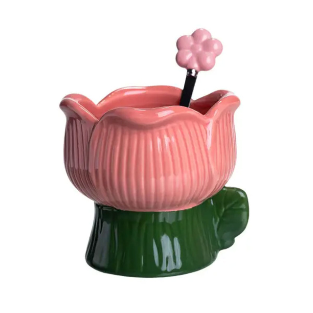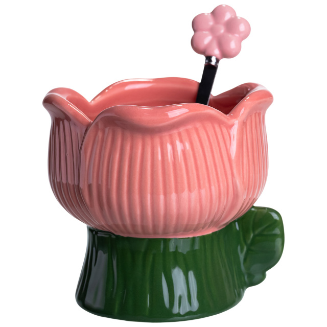 Креманка фарфоровая с ложкой в форме цветка 300 (мл) креманка для десертов, мороженого и желе Зеленый с розовым FM-42GR
