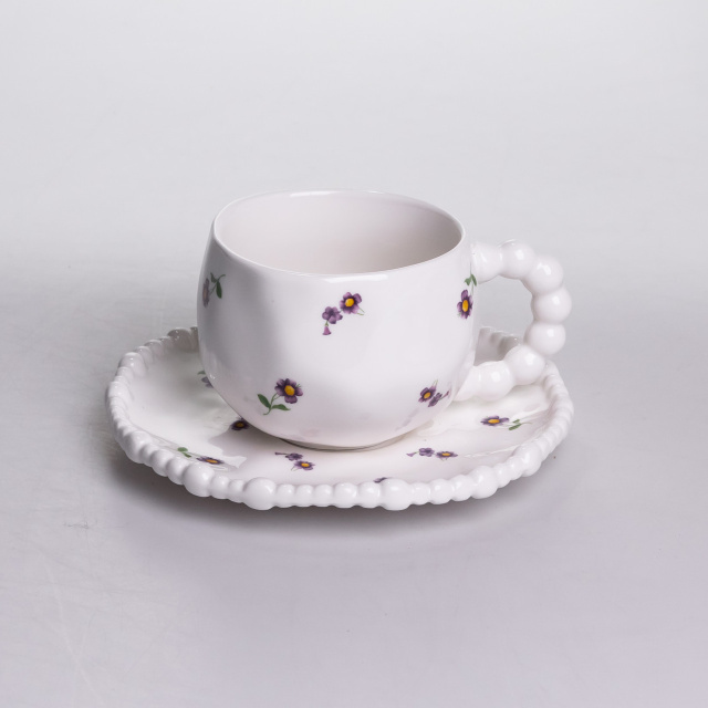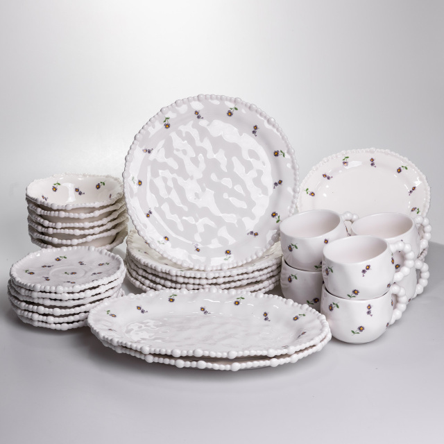 Фарфоровый столовый сервиз Pearl на 6 персон (32 предмета) - набор посуды с объемным декором в виде жемчужин и цветов Особого внимания заслуживают чашки с уникальной ручкой, выполненной в виде кольца из больших бусин – деталь, которую хочется рассматривать и держать в руках. Белоснежный фарфор деликатно украшают мелкие фиолетовые цветы, разбросанные по поверхности, словно на весеннем поляне. Такой набор станет идеальным выбором для любителей нестандартных форм и тактильно приятны текстуры. Благодаря расширенной комплектации с овальными блюдами, вы сможете создать полноценную сервировку как для семейного обеда, так и для праздничного ужина. Характеристики столового сервиза, набора тарелок и чашек: Тип изделия: обеденный столовый сервиз, набор для сервировки стола; Материал: качественный фарфор; Общее число предметов: 32 единицы; Количество персон: 6 человек; Декор и дизайн: рельефный край в виде шариков (жемчужин), цветочный принт, фигурная ручка; Цвет: белый с фиолетовым узором; Форма: круглая/овальная с фигурным краем; Особенности: уникальная ручка чашек с имитацией ожерелья. Комплектация и размеры предметов (состав набора): Тарелка обеденная большая (диаметр 26 см) – 6 шт; Тарелка десертная/закусочная (диаметр 21 см) - 6 шт; Глубокая тарелка/пиала (диаметр 17 см, объем 500 мл) - 6 шт; Чашка чайная (объем 300 мл, диаметр 10 см) - 6 шт; Блюдце (диаметр 14,5 см) — 6 шт; Блюдо сервировочное овальное большое (размер 36 х 20 см) - 2 шт. Этот сервиз - воплощение нежности и оригинальности. Название Pearl (Перлина) здесь неслучайно: каждый предмет набора обрамлен объемным рельефным краем, напоминающим россыпь драгоценных жемчужин. Этот дизайн превращает обычную посуду в настоящее украшение стола, добавляя интерьеру нотки романтики и легкости.