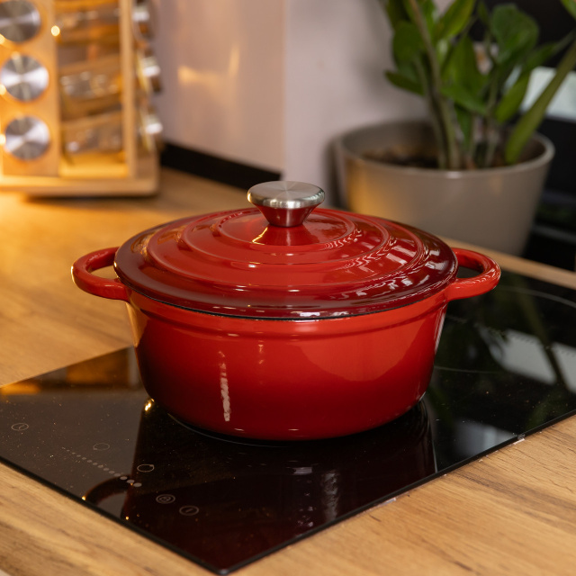 Чугунная кастрюля с эмалированным покрытием, 2.5 л – надежная и стильная посуда для запекания, тушения и длительного томления. Чугунная основа равномерно распределяет тепло и долго сохраняет его, обеспечивая идеальные условия для приготовления насыщенных и ароматных блюд. Основные характеристики чугунной кастрюли: Объем: 2.5 л; Диаметр: 22 см; Внутренний диаметр: 18 см; Высота: 15 см; Высота без крышки: 9 см; Толщина стенок 5 мм; Материал: чугун; Покрытие: эмаль; Тип крепления ручек: литий; Тип плиты: все типы плит. Преимущества чугунной кастрюли жаровни: Эмалированное покрытие защищает от окисления, предотвращает пригорание и упрощает уход. Чугунная конструкция сохраняет тепло дольше, обеспечивая равномерное приготовление без резких перепадов температуры. Подходит для всех типов плит: газовых, электрических, индукционных, а также для использования в духовке. Прочные литые ручки удобны для переноски и устойчивы к высоким температурам. Классический дизайн и функциональность делают эту кастрюлю незаменимой на кухне, помогая создавать блюда ресторанного уровня в домашних условиях.