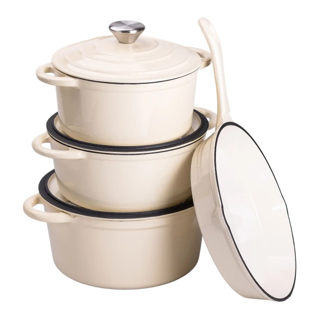 Набор чугунной посуды создан для тех, кто ценит качество и удобство в приготовлении пищи. В него входят три кастрюли объемом 2, 3 и 4 литров, а также компактная сковорода на 1 литр. Такой набор позволяет с легкостью готовить супы, рагу, мясные и овощные блюда, обеспечивая идеальное распределение тепла. Чугун отличается высокой теплоемкостью, что способствует равномерному прогреву продуктов и сохранению их естественного вкуса. Толстые стенки и дно предотвращают перегрев и обеспечивают стабильную температуру во время готовки. Литые ручки удобны в использовании и устойчивы к высоким температурам. Основные характеристики набора чугунной посуды с эмалированным покрытием Кастрюля на 2 литра Диаметр дна: 16,5 см; Высота кастрюли без крышки: 9,5 см; Высота кастрюли с крышкой: 16 см. Кастрюля на 3 литра Диаметр дна: 19 см; Высота кастрюли без крышки: 9 см; Высота кастрюли с крышкой: 16 см. Кастрюля на 4 литра Диаметр дна 21 см; Высота кастрюли без крышки: 11 см; Высота кастрюли с крышкой: 16 см. Сковорода на 1 литр Диаметр дна: 22 см; Высота сковороды с крышкой: 4 см. Посуда подходит для газовых и электрических плит, а также для приготовления на открытом огне, что делает ее отличным выбором как для кухни, так и для кулинарных экспериментов на природе. При правильном уходе чугун служит десятилетиями, не теряя своих свойств. Этот набор станет незаменимым помощником для любителей вкусных и насыщенных блюд, обеспечивая удобство и долговечность на долгие годы.
