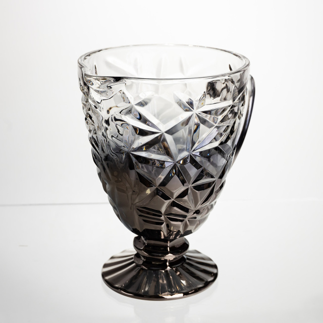Кувшин для напитков из толстого стекла объемом 1.2 л. Прозрачный материал и сбалансированная форма обеспечивают удобство использования и аккуратный внешний вид. Поверхность кувшина полностью украшена рельефным геометрическим узором из треугольных граней. В нижней части грани имеют вырезы, создающие выразительный трехмерный эффект и заметную игру света. Декор равномерный и не перегружает общий дизайн. Высота 20 см и диаметр 14 см обеспечивают стабильность на столе. Конструкция на ножке с плавным переходом в основание придает изделию целостности, а толстое стекло подчеркивает практичность и надежность. Основные характеристики кувшина для напитков: Тип: кувшин для напитков; Объем: 1.2 л; Материал: толстое стекло; Высота: 18 см; Диаметр: 13 см; Конструкция: на ножке. Кувшин идеально подходит для использования дома, в кафе или на праздничном столе. Его можно мыть вручную или в посудомоечной машине. Посуда, сочетающая функциональность и привлекательный вид для ежедневной и особой сервировки.