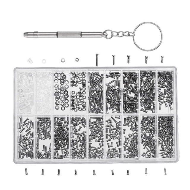 В набор входят винты (длина х диаметр): 9.0 мм х 1.25 мм; 6.8 мм х 1.25 мм; 5.3 мм х 1.4 мм; 4.5 мм х 1.25 мм; 4.6 мм х 1.25 мм; 4.5 мм х 1.20 мм; 4.2 мм х 1.3 мм; 4.0 мм х 1.3 мм; 3.7 мм х 1.3 мм; 3.65 мм х 1.25 мм; 3.4 мм х 1.35 мм; 3.3 мм х 1.4 мм; 4.25 мм х 0.9 мм; 5.25 мм х 0.9 мм; гайки с внутренним диаметром резьбы 1.25 мм; шайбы и пластиковые заглушки на винты.