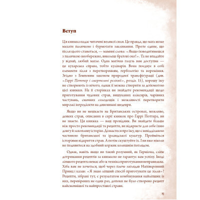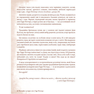 Смакуючи гарбузовим печивом; пончиками з джемом; солодкою помадкою або чимось іншим; ви зможете на деякий час стати одним із героїв захопливих історій про хлопчика-чарівника. Подарункове видання; оформлене під старовину;  містить докладні рецепти; зібрані в десяти розділах. Завдяки точним інструкціям ви легко зможете приготувати будь-яку страву.