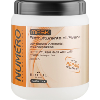 Ваши волосы стали сухими и ломкими в результате частых укладок феном и плойками? Не отчаивайтесь; выход есть. Профессиональная восстанавливающая маска для волос с экстрактом овса Numero Total Repair Mask от итальянской торговой марки Brelil идеально справится с этими проблемами!