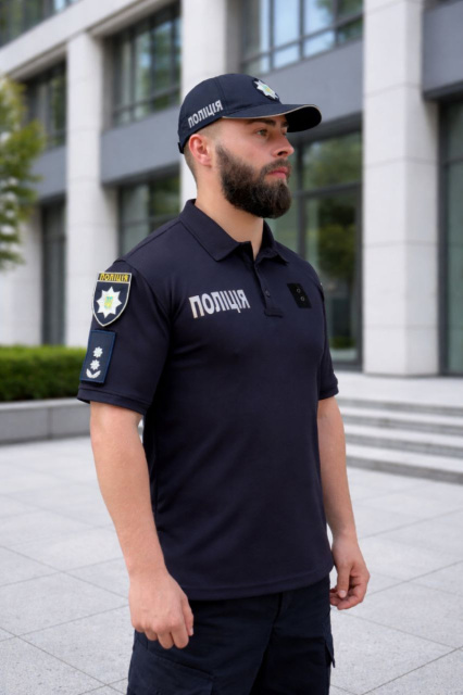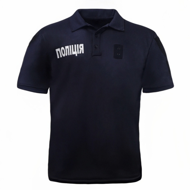Класичний крій з короткими рукавами, зручним коміром з застібкою на три ґудзики, який не стискає шию. На передній та задній частині футболки розміщено чіткий напис "ПОЛІЦІЯ", що робить її легко впізнаною та забезпечує професійний вигляд. Напис виконано за допомогою друку світловідбиваючої плівки. На рукавах велкро платформи (липучки) для кріплення шевронів, а на грудях зліва спеціальне кріплення для жетону. Футболка доступна у чорному та темно-синьому кольорах, які відповідають стандартам уніформи поліції.
