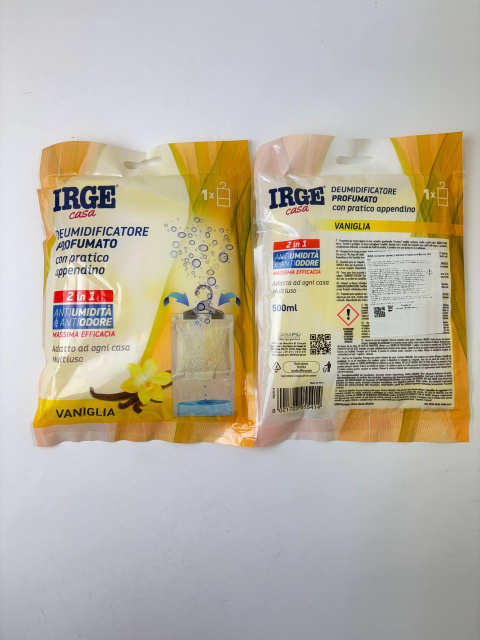 IRGE з підвіскою — компактний автономний поглинач вологи: активні кристали абсорбують надлишкову вологу з повітря та збирають її в нижній резервуар. Аромат Ваніль делікатно наповнює простір затишним солодкуватим відтінком, нейтралізуючи затхлі запахи.