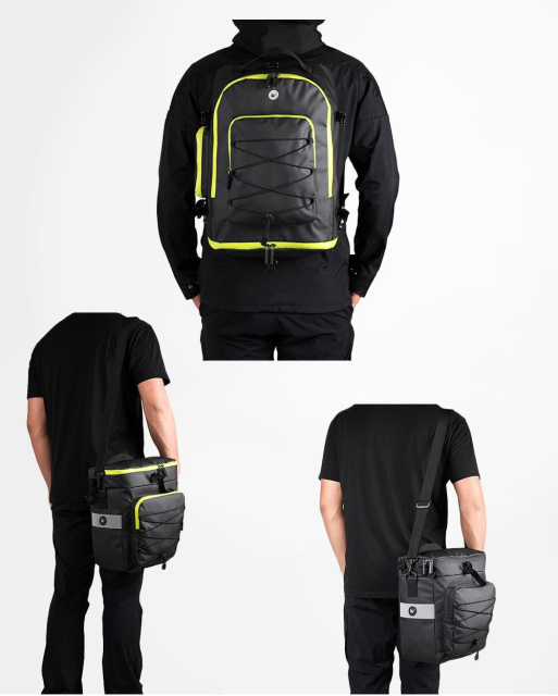 Велосумка Rhinowalk 3в1 легко фіксується на багажник заднього сидіння велосипеда. Не заважає при пересуванні та зручна у використанні. Бокову сумку можна носити на плечі, оскільки в комплекті є плечовий ремінь. У рюкзак поміщається комп'ютер, планшет та інші гаджети, також можна покласти шолом та пляшку з водою. Велорюкзак можна використовувати окремо від інших сумок, їздити з ним на роботу, навчання чи туристичні походи.