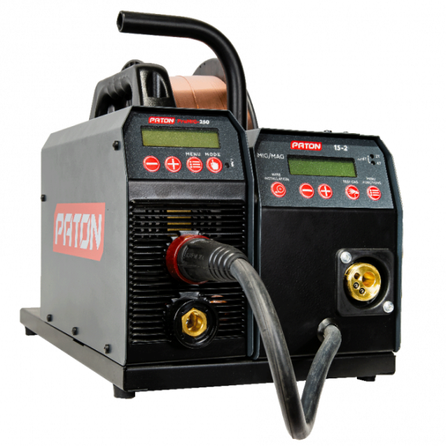 Інверторний цифровий напівавтомат PATON ProMIG-250-15-2 - це апарат для професійного використання, призначений для ручного дугового зварювання (РДЗ «MMA»), аргонодугового зварювання (АРГ «TIG») і напівавтоматичного зварювання (НА «MIG / MAG»), постійним струмом, в середовищі захисних газів і сумішей. В апараті ProMIG-250-15-2 реалізований повністю цифровий спосіб управління, за рахунок чого забезпечуються його багатофункціональність і широкі можливості в точному налаштуванні режимів зварювання. Підвищений показник тривалості навантаження на номінальному струмі до 250А, дозволяє працювати будь-якими електродами діаметром від 1,6 мм до 6 мм (легкоплавкі), а також напівавтоматичне зварювання суцільним дротом діаметром від 0,6 до 1,2 мм. Завдяки двокорпусному виконанню, джерело струму можна з легкістю відокремити від блоку подачі дроту, що значно підвищує мобільність і зручність роботи в режимах MMA і TIG.