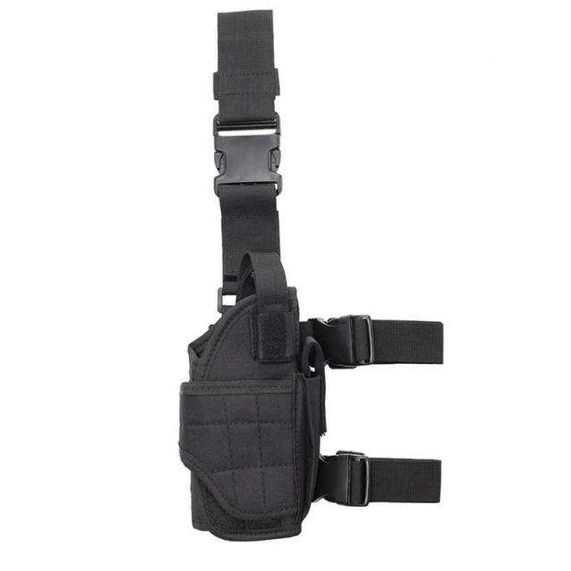 Завдяки міцному ременю з регульованими фіксаторами кобура тактична надійно кріпиться до ноги та до пояса. Липучка на стропі дає можливість регулювати вертикальне положення платформи.