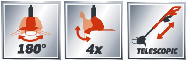 Особливістю даної моделі є регулювання головки двигуна на 180° і з можливістю нахиляти під кутом у чотирьох різних положеннях для зрізання трави вздовж вертикальних поверхонь і країв газонів.