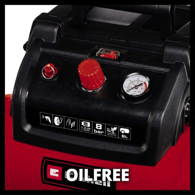 Завдяки використанню ідеально підігнаних компонентів безмасляний компресор Einhell TC-AC 190/6/8 OF працює повністю без олії, тому компресор не вимагає технічного обслуговування з контролю та доливання олії.