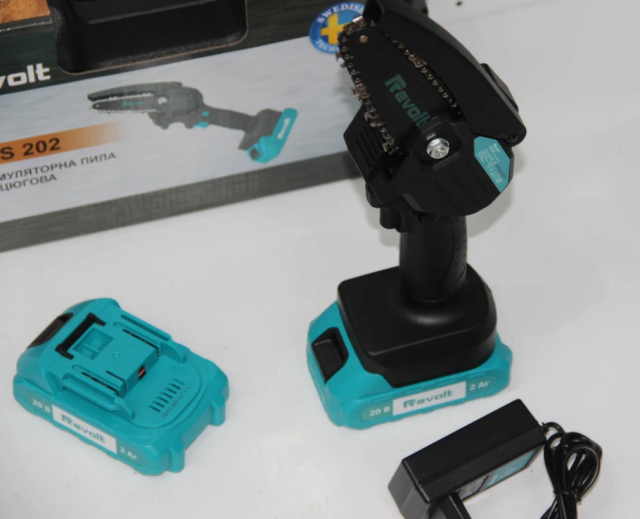 Ланцюгова міні пила акумуляторна Revolt BCS 202 з плавним пуском призначена для зрізання або обрізання гілок, розпилювання свіжої, сухої та мокрої деревини діаметром 90 мм або менше, для заготівлі дров колод малого діаметра.