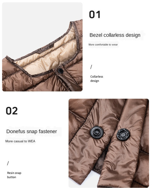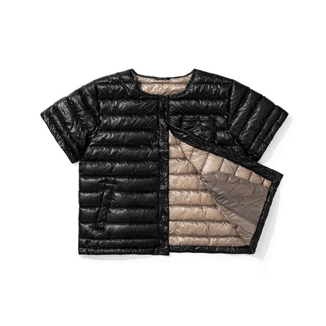 Наповнювач жилета виготовлений з гусячого пуху, здатного утримувати вологу, не пропускаючи і не вбираючи її. Підкладка не мнеться і приємна на дотик. Рукава даної моделі мають коротку довжину до ліктя.