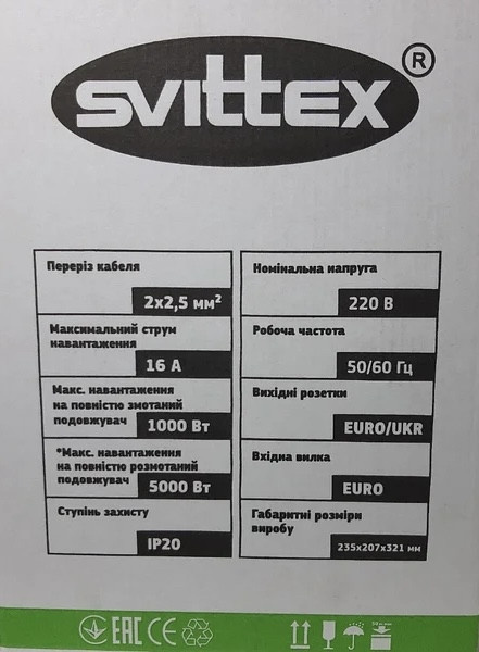 Подовжувач на котушці довжиною 30 м перетином проводу 2х2,5 мм². Розрахований на два типи вилок як "російського", так і "євро", що робить її універсальною.