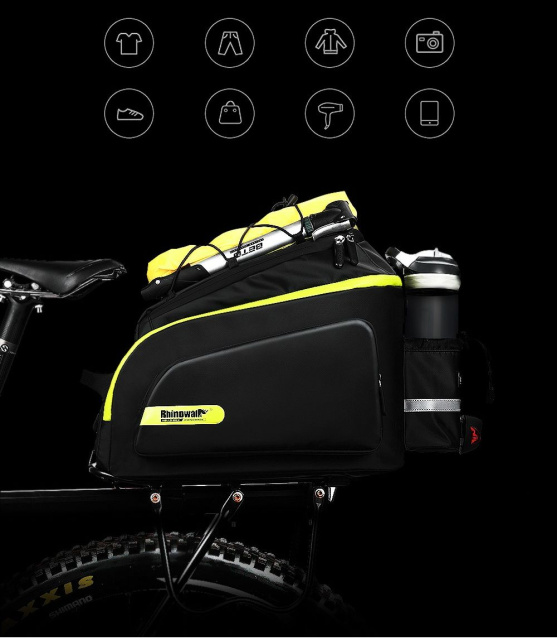 Велосумка на багажник із тримачем для фляги Rhinowalk Multifunctional фіксується на велосипеді під сідлом спеціальними ременями у чотирьох точках. Має велику місткість для зберігання необхідних предметів, які завжди повинні бути під рукою. Додатково є спеціальний мішечок із еластичним шнуром для зручного розміщення пляшки з водою. Особливістю сумки є водонепроникність.