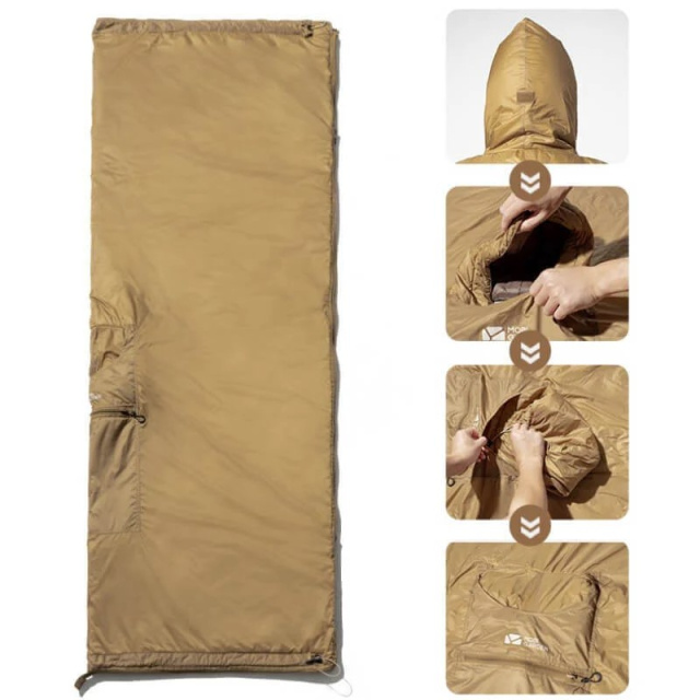 Mobi Garden CL style має унікальну конструкцію, що дозволяє з легкістю перетворити спальний мішок на пончо, забезпечуючи тим самим свободу рухів та тепло в прохолодну погоду. Виготовлений з легкої та міцної тканини 20D, яка відштовхує воду та бруд, він має передові технології утеплення, щоб забезпечити захист від непогоди. Спальний мішок оснащений регульованим капюшоном, який забезпечує додатковий захист від вітру та холоду, а також може бути компактно складений для зручності транспортування. Практична кишеня на грудях на блискавці робить доступ до особистих речей швидким та зручним. Внутрішня петля для підвішування додає зручності для зберігання аксесуарів, таких як рукавички або окуляри. Спальний мішок-пончо є відмінним вибором для тих, хто шукає багатофункціональне обладнання, яке забезпечить комфорт та тепло вночі, а вдень свободу рухів та адаптацію до різних погодних умов. Характеристики: Розмір: 200*145 см Розмір у складеному вигляді: 17*17*28 см Температура комфорту: 20 Ліміт комфорту: 10 Екстремальна температура: 5 Наповнювач: поліефірне волокно Матеріал: нейлон 20D Вага: понад 680 г